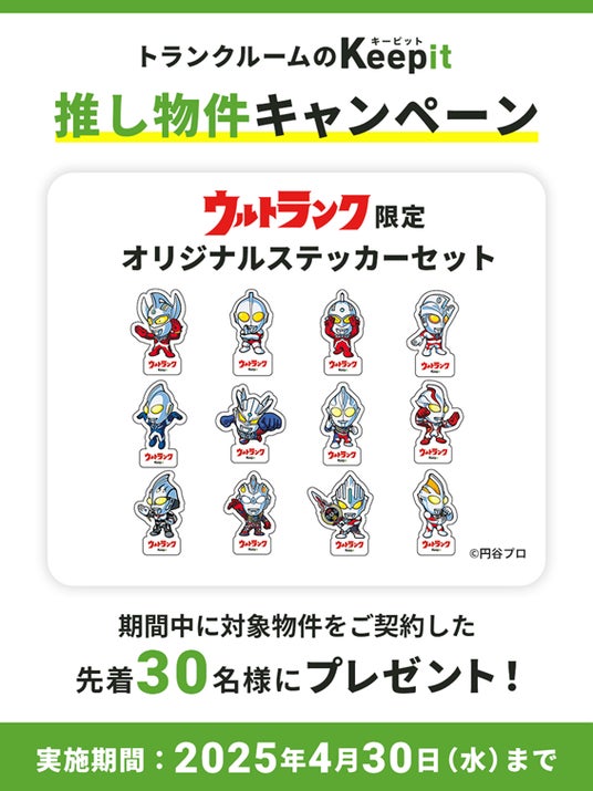 キャンペーン対象は、キーピットブランドの推奨物件8施設にご契約いただいた先着30名様に、人気のウルトラヒーロー12種類の限定ステッカーをセットでプレゼントいたします。