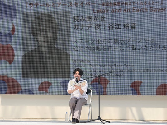 アニメ「地球のラテール」より、カナデ役・声優の谷江玲音さんが登場し、原作となる絵本「ラテールとアースセイバー~絶滅危惧種が教えてくれること~」の読み聞かせを行いました。