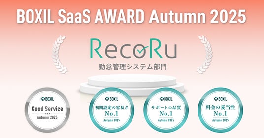 中央システム株式会社(本社:東京都新宿区、代表取締役社長:本間 匡、以下中央システム)が提供するクラウド勤怠管理システム「RecoRu(レコル)」は、スマートキャンプ株式会社(以下スマートキャンプ)が主催する「BOXIL SaaS AWARD Autumn 2025」の勤怠管理システム部門で「Good Service」「初期設定の容易さNo.1」「サポートの品質No.1」「料金の妥当性No.1」に選出されました。
