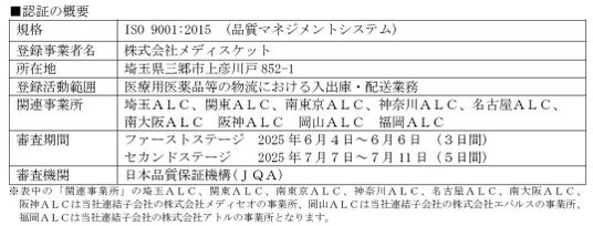 株式会社メディパルホールディングス(東京都中央区、代表取締役社長:渡辺 秀一)の連結子会社である株式会社メディスケット(埼玉県三郷市、代表取締役社長:若菜 純、以下、「メディスケット」)は、品質マネジメントシステムに関する国際規格「ISO9001」の認証を関連事業所である9か所のALCにおいて取得しましたので、お知らせします。