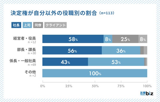 「部長・課長」は56%が、「係長・一般社員」は43%が「社長」を最終決裁者として回答しています。今回の調査では従業員規模が小さい企業の回答が多かったことから、最終的な発注の決定権が社長に集中する傾向が強く表れたと考えられます。