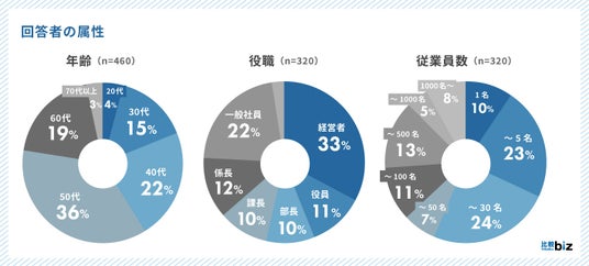 回答者の年齢は50代が最も多く、役職の内訳を見ると「経営者」が33%、「一般社員」が22%と、比較的年齢層が高くなっています。役職者、特に経営者からの回答が多く見られますが、小規模な会社が多く、利用者の役職も高い傾向があると考えられます。