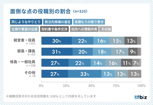 役職に関わらず「同じようなやりとり」が最も面倒だと感じていることがわかりました。発注業務におけるコミュニケーション負担の大きさがうかがえます。