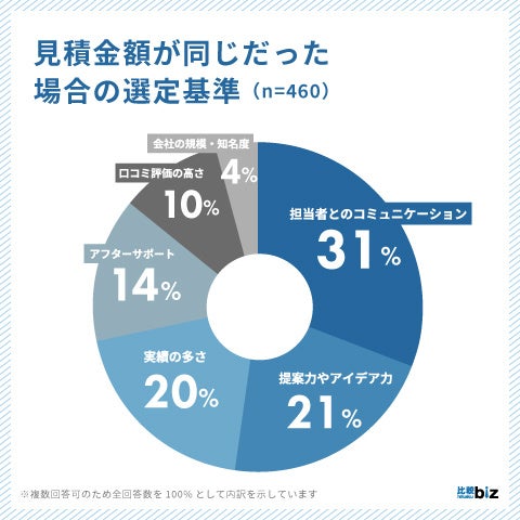 次いで、「提案力やアイデア力」(21%)や「実績の多さ」(20%)が挙げられました。価格以外の点では、どれだけ付加価値を感じられるかが、発注先の選定において重要な比較軸となっている傾向がわかります。