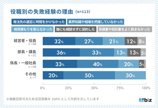 発注における失敗要因として「発注先選定に十分な時間をかけなかった」や「業界知識・相場の理解不足」など、準備や情報収集の不足が多く挙げられました。特に、経営層ではスピードを重視した判断により、失敗につながるケースも見られます。こうした背景から、冷静な比較検討や十分な情報収集の必要性が示唆されます。