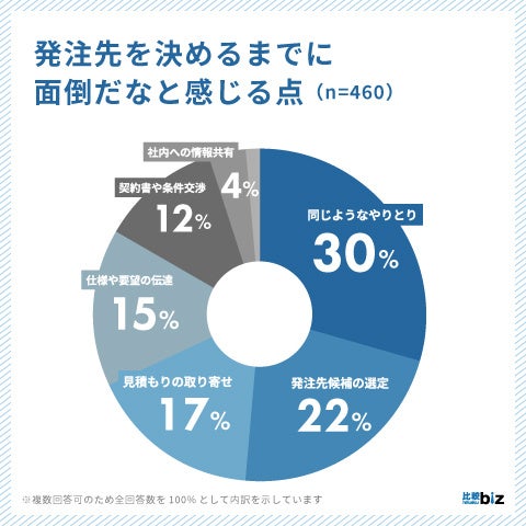 また、「発注先候補の選定」(22%)や「見積もりの取り寄せ」(17%)にも多くの回答が集まっており、発注先を比較・検討しながら選定するプロセスにおいて、手間や煩わしさを感じている人が多いことがわかります。