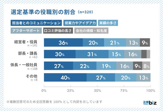 一方で、「部長・課長」では「提案力やアイデア力」が31%と最も高く、実務的かつクリエイティブな提案が選定のポイントになっていることが分かります。対して「係長・一般社員」は「会社の規模・知名度」の選択が多く、リスクを避けて安定性を求める傾向が見受けられます。