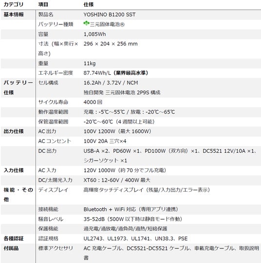 株式会社ヨシノパワージャパン(以下「ヨシノ」)は、2025年4月17日、あらゆる使用環境に対応した新型ポータブル電源『YOSHINO B1200 SST』(1,085Wh)を発表いたしました。本製品はこれまでヨシノがポータブル電源を展開してきた中でお客様から高いニーズがあった1kWh(1,000Wh)帯の容量を、世界最小クラス(※1:TUV SUD Sクラス認証)で実現したポータブル電源です。ヨシノは世界初の固体電池搭載ポータブル電源(※2)を開発しており、本製品も従来のポータブル電源が苦手としてきた極低温環境や過酷な使用条件でも安定した性能を発揮します。4月17日より各種販売チャネルにて予約受付を開始し、5月26日より発売いたします。