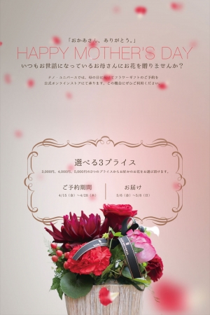 1年に1度のこの機会に日頃なかなか言えない感謝の想いをお花と一緒に伝えませんか?部活やバイト、仕事で忙しくて買いに行けないた方や遠方に住んでいて中々会えない方などにナノ・ユニバースが、母の日のギフトをお手伝い致します。オンラインサイトのみで予約販売するオリジナルブーケは、今から忘れることなくお求め頂け、確実にお母様や奥様の元に感謝の気持ちを届ける事が出来ます。是非、この機会にご利用ください。