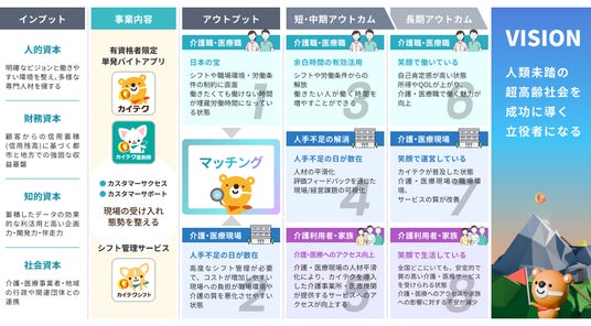当社が提供するスポットワークシェアサービス『カイテク』とシフト管理サービス『カイテクシフト』はこうした課題を解消し、埋蔵労働時間の活用を可能にします。長期的には、当社のサービスが社会のインフラとして広く浸透することで、介護職・医療職の方の所得向上や生活の質(QOL)の改善、ひいては介護職・医療職そのものの魅力の向上を促すとともに、介護・医療現場のサービスの質を改善し、また介護や医療の利用者様とそのご家族が、全国どこにいても安定的で質の高い介護・医療サービスを受けることのできる社会の実現に貢献してまいります。