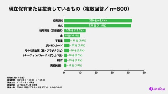 800名に対し、現在保有または投資しているものを複数回答で尋ねたところ、最も多かったのは「投資信託」で42.4%、次いで「株式」が41.8%でした。3位には「暗号資産(仮想通貨)」が13.5%で入りました。