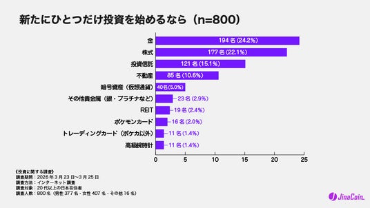 - 新たにひとつだけ始めるなら「金」が24.2%で1位、「株式」(22.1%)を上回る