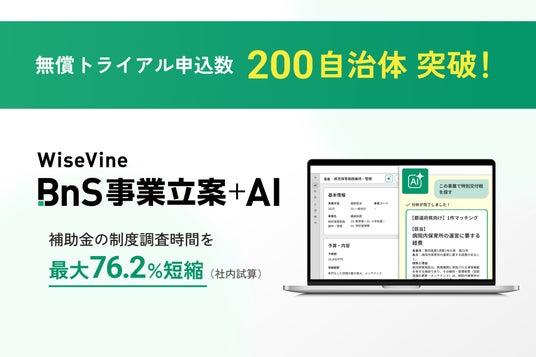 株式会社WiseVine(本社:愛媛県松山市、代表取締役:吉本翔生)は、自治体の事業立案・予算編成・行政評価業務に特化した生成AIサービス「WiseVine BnS事業立案+AI」の無償トライアル※について、当初想定を上回る自治体からのお申し込みをいただき、全国自治体数の1割を超える規模に達しましたことをお知らせいたします。