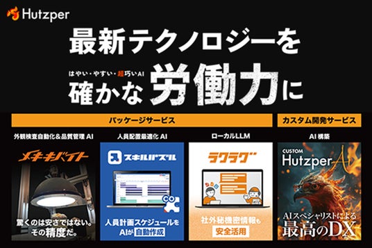 フツパー社は『最新テクノロジーを確かな労働力に』をミッションに掲げ、製造業向けにAI技術を活用したソリューションを提供するスタートアップです。主力サービスである外観検査自動化AI「メキキバイト」をはじめ、AI受託開発サービス「カスタムHutzperAI」、人材配置最適化システム「スキルパズル」、さらにインターネット接続不要の生成AI「ラクラグ」など、製造現場のDXを支援する幅広いサービスを展開しています。