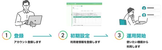 ご利用開始までの流れは、すべてWEBで完結します。登録→初期設定→運用開始の簡単3ステップで運用をスタートしていただけます。