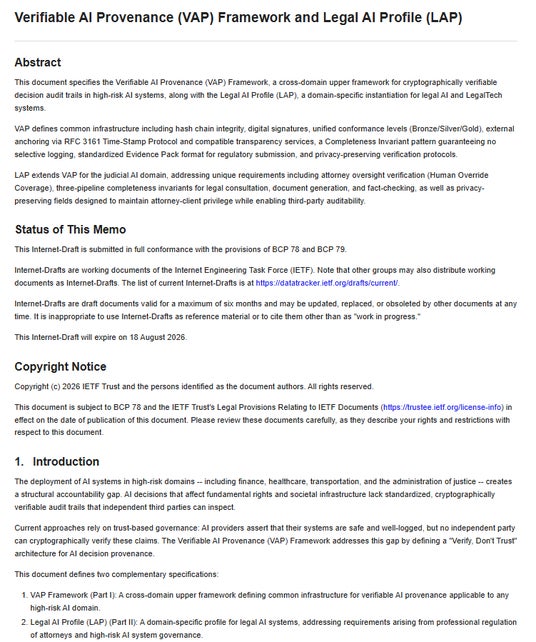 AI判断の証跡(プロベナンス)を暗号学的に検証可能にするフレームワーク「VAP」と、司法AI向けプロファイル「LAP(Legal AI Profile)」の技術仕様をIETFに提出。(VAP/LAP)