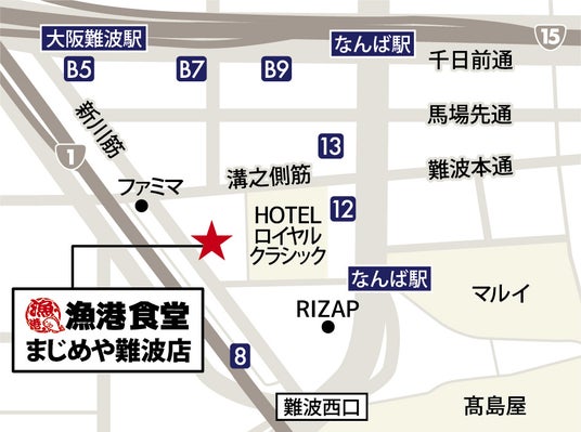 漁港食堂 まじめや難波店マップ