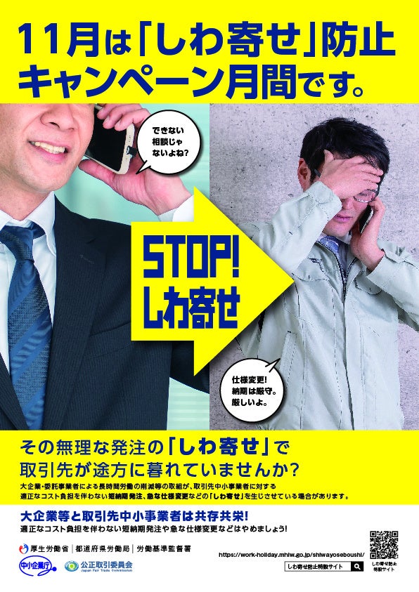 厚生労働省は、中小企業庁および公正取引委員会と連携し、11月を「『しわ寄せ』防止キャンペーン月間」として、周知啓発ポスターの掲示、業所管省庁や都道府県、労使団体への協力依頼など、集中的な周知・啓発の取り組みを行います。