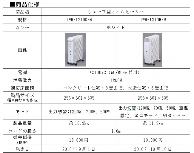 生活用品製造卸のアイリスオーヤマ株式会社(本社:仙台市、代表取締役社長:大山 健太郎)は、独自形状の放熱フィンを採用した「ウェーブ型オイルヒーター」2機種を2016年9月1日より順次発売します。全国の家電量販店、ホームセンターを中心に販売し、初年度合計3万台の出荷を目指します。