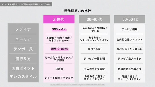 Z世代、30-40代、50-60代の3世代で「笑い」のスタイルを比較。メディア、ユーモア、テンポ・尺、流行り方、面白ポイント、笑いのスタイルの6項目で分析しています。Z世代は「SNSメイン」「不謹慎/皮肉/自虐」「短尺(~15秒)」「ミーム化/二次創作」といった特徴が挙げられています。