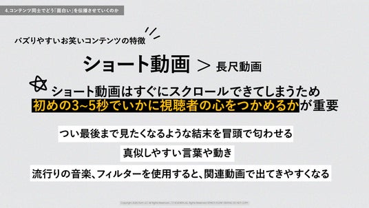 Z世代に響き、バズを生みやすいコンテンツの具体的な特徴を解説。ショート動画では「初めの3~5秒」でいかに心を掴めるかが重要であること、また、「真似しやすい言葉や動き」「流行りの音楽、フィルターの使用」が拡散の鍵を握ると分析しています。