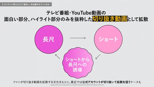テレビ番組やYouTubeの長尺動画の面白い部分だけを抜粋した「切り抜き動画」がショート動画として拡散される流れを図示。最近では公式アカウント自らが切り抜き動画を投稿するケースも増えていると指摘しています。このショート動画がきっかけとなり、元となった長尺動画への誘導が起こるという、現代的なコンテンツ消費サイクルを解説しています。
