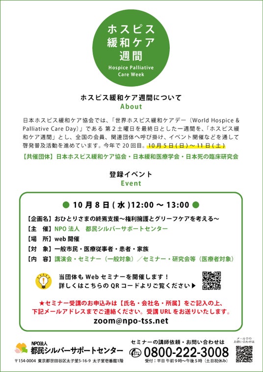 NPO法人都民シルバーサポートセンター(所在地:東京都世田谷区、代表:信夫武人)は、毎年10月の第2土曜日を最終日とする一週間(今年は10月5日(日)から11日(土))の「ホスピス緩和ケア週間」に合わせ、Webセミナーを開催いたします。