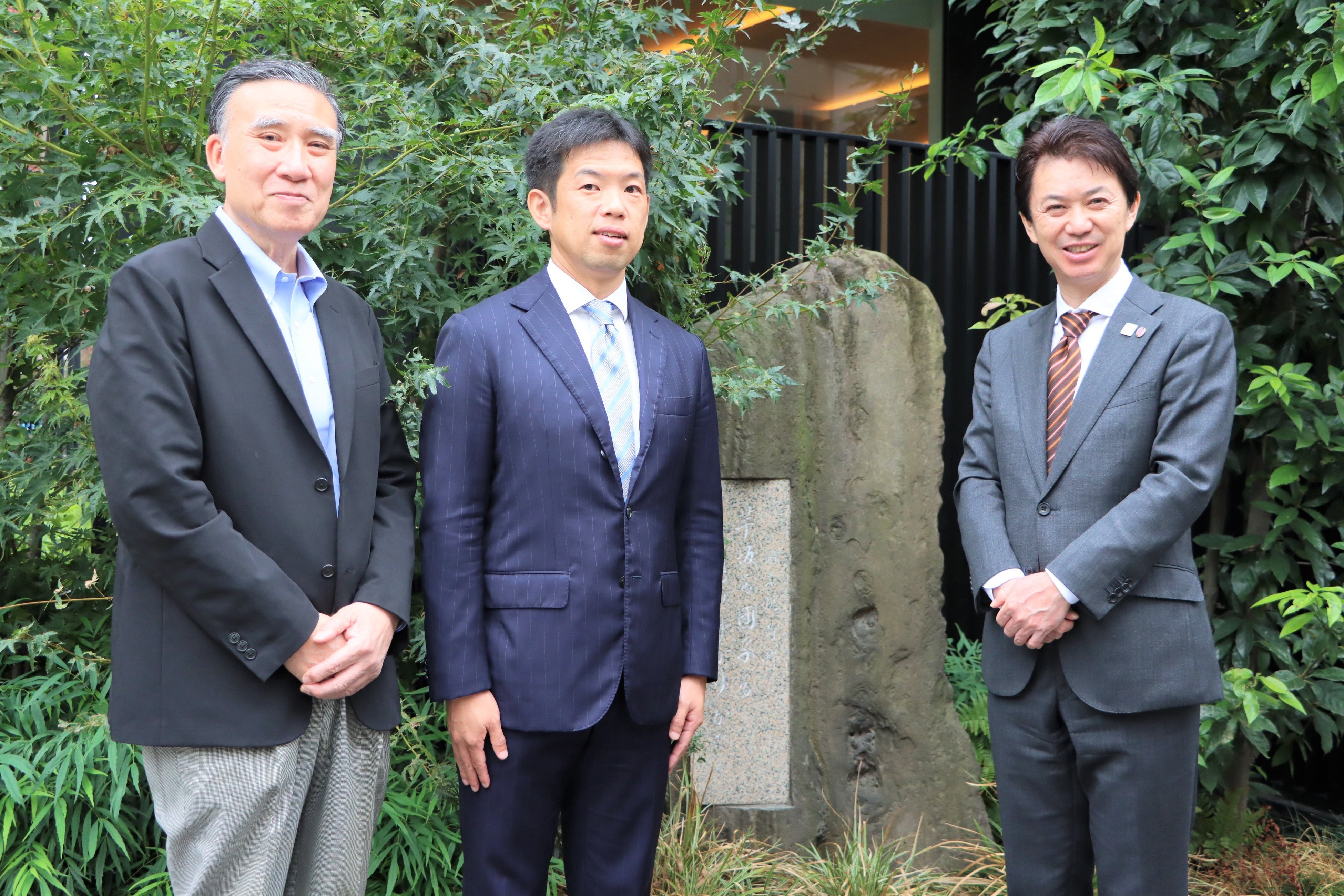 (写真左から)滝口学区長、株式会社羽二重団子澤野修一代表取締役、松山市田淵雄一郎副市長