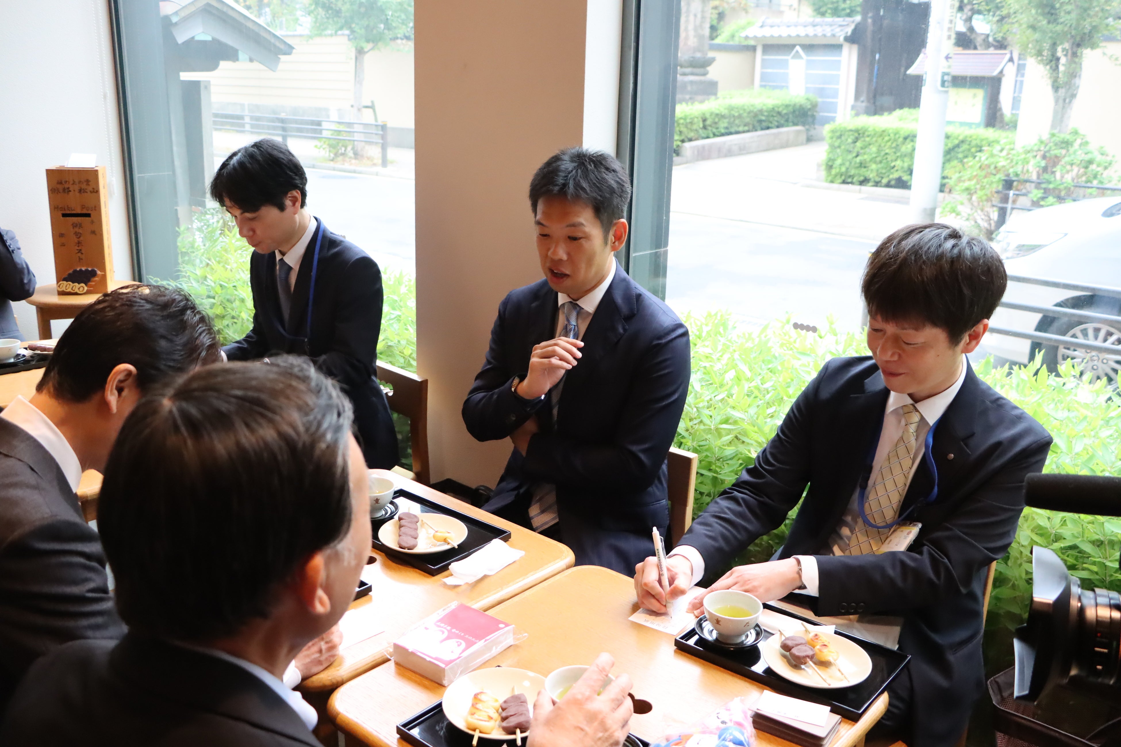 この日、松山市から田淵副市長にお越しいただき、区役所で滝口区長と面会、懇談が行われました。懇談では、荒川区の俳句文化振興の取組や松山市の俳句関連の施策・事業等について情報交換しました。そのあと、「俳都松山荒川区俳句ポスト設置10周年記念イベント」のメインセレモニーの会場となる、荒川区・日暮里の「羽二重団子本店」に会場を移し、株式会社羽二重団子の澤野修一代表取締役、松山市の田淵雄一郎副市長、滝口学区長が一堂に会しました。セレモニーでは、田淵副市長、滝口区長から澤野代表取締役へ記念品の贈呈が行われたのち、羽二重団子をいただきながら懇談が行われたほか、子規の「芋坂も団子も月のゆかりかな」の句碑の前での記念撮影やこの日を記念して滝口区長と田淵副市長が詠んだ句を「俳都松山俳句ポスト」に投句するなど、和やかな雰囲気の中、貴重な交流・情報交換の時を持つことができました。今後も松山市、羽二重団子、荒川区は俳都松山市俳句ポストをはじめ、俳句を通した親交を深めていくことを確認しました。