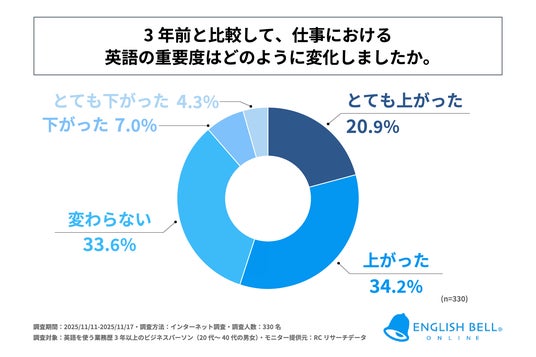 英語を使う業務歴3年以上のビジネスパーソンの55%以上が、3年前と比較して、仕事における英語の重要度は上がったと感じている