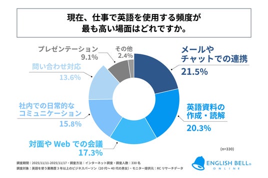 まず、「現在、仕事で英語を使用する頻度が最も高い場面はどれか」を尋ねる設問への回答では、1位が「メールやチャットでの連携」で21.5%、2位が「英語資料の作成・読解」で20.3%、3位が「対面やWebでの会議」で17.3%という結果になりました。この結果から、英語を使う業務歴3年以上のビジネスパーソンが現在、仕事で英語を使用する頻度が最も高い場面は「メールやチャットでの連携」であることが明らかになりました。