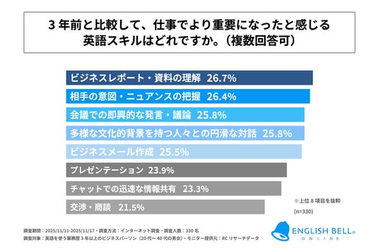 また、「3年前と比較して、仕事でより重要になったと感じる英語スキルはどれか」を尋ねる設問への回答では、1位が「ビジネスレポート・資料の理解」で26.7%、2位が「相手の意図・ニュアンスの把握」で26.4%、3位が同率で「会議での即興的な発言・議論」と「多様な文化的背景を持つ人々との円滑な対話」で25.8%という結果になりました。この結果から、3年前と比較して、仕事でより重要になったと感じる英語スキルは主に「ビジネスレポート・資料の理解」や「相手の意図・ニュアンスの把握」であることが明らかになりました。