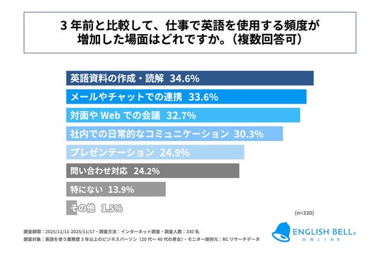 続いて、「3年前と比較して、仕事で英語を使用する頻度が増加した場面はどれか」を尋ねる設問への回答では、1位が「英語資料の作成・読解」で34.6%、2位が「メールやチャットでの連携」で33.6%、3位が「対面やWebでの会議」で32.7%という結果になりました。この結果から、3年前と比較して、仕事で英語を使用する頻度が増加した場面で最も多いのは「英語資料の作成・読解」であることが判明しました。