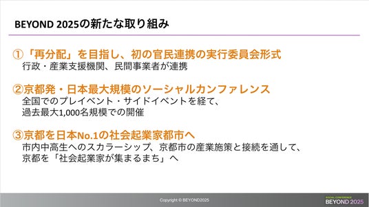 続いて、実行委員会組成の経緯や意義、京都市が取り組む社会的インパクト創出のための施策方針、BEYOND2025の新たな取り組みやコンテンツ詳細などについて、それぞれから発表しました。