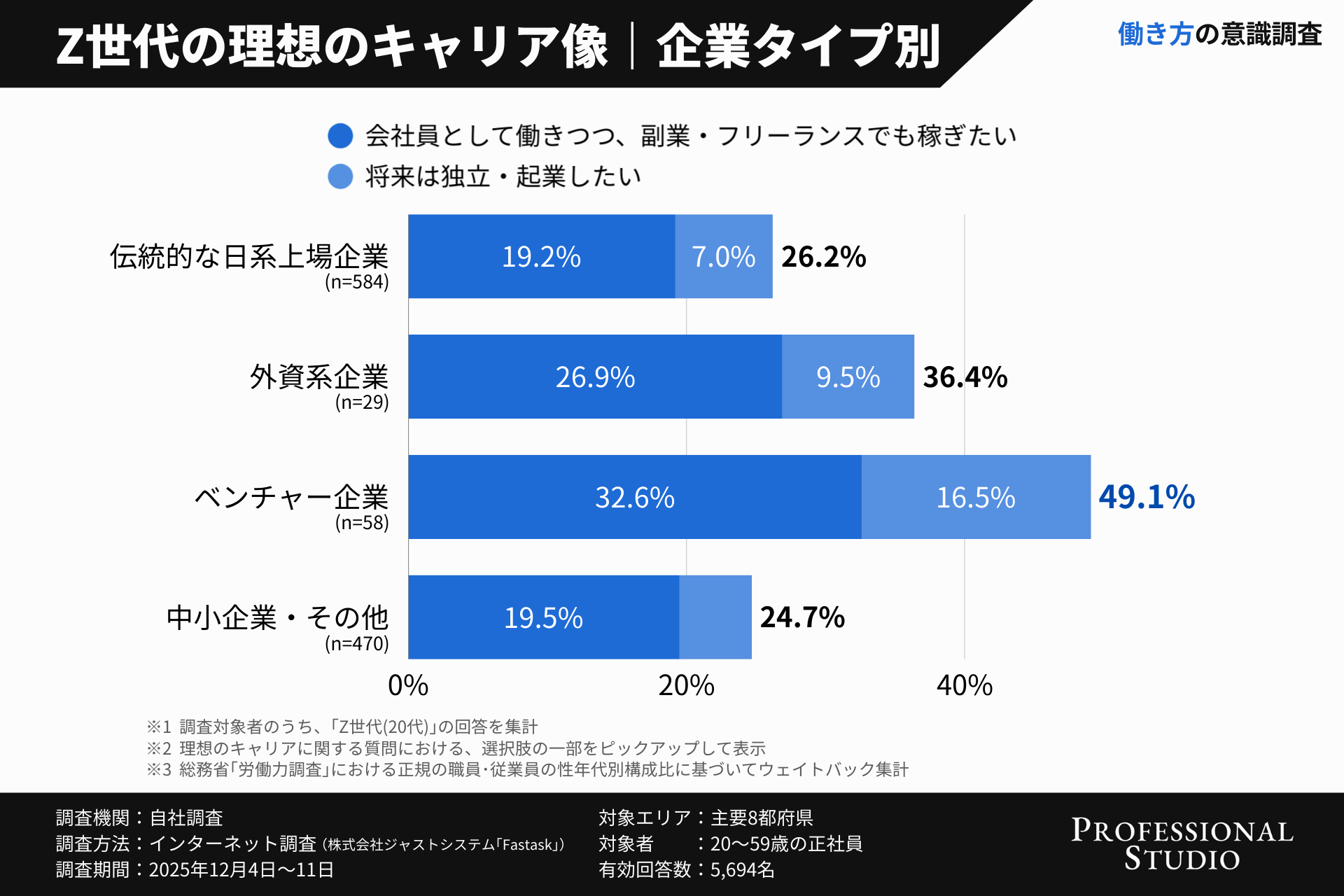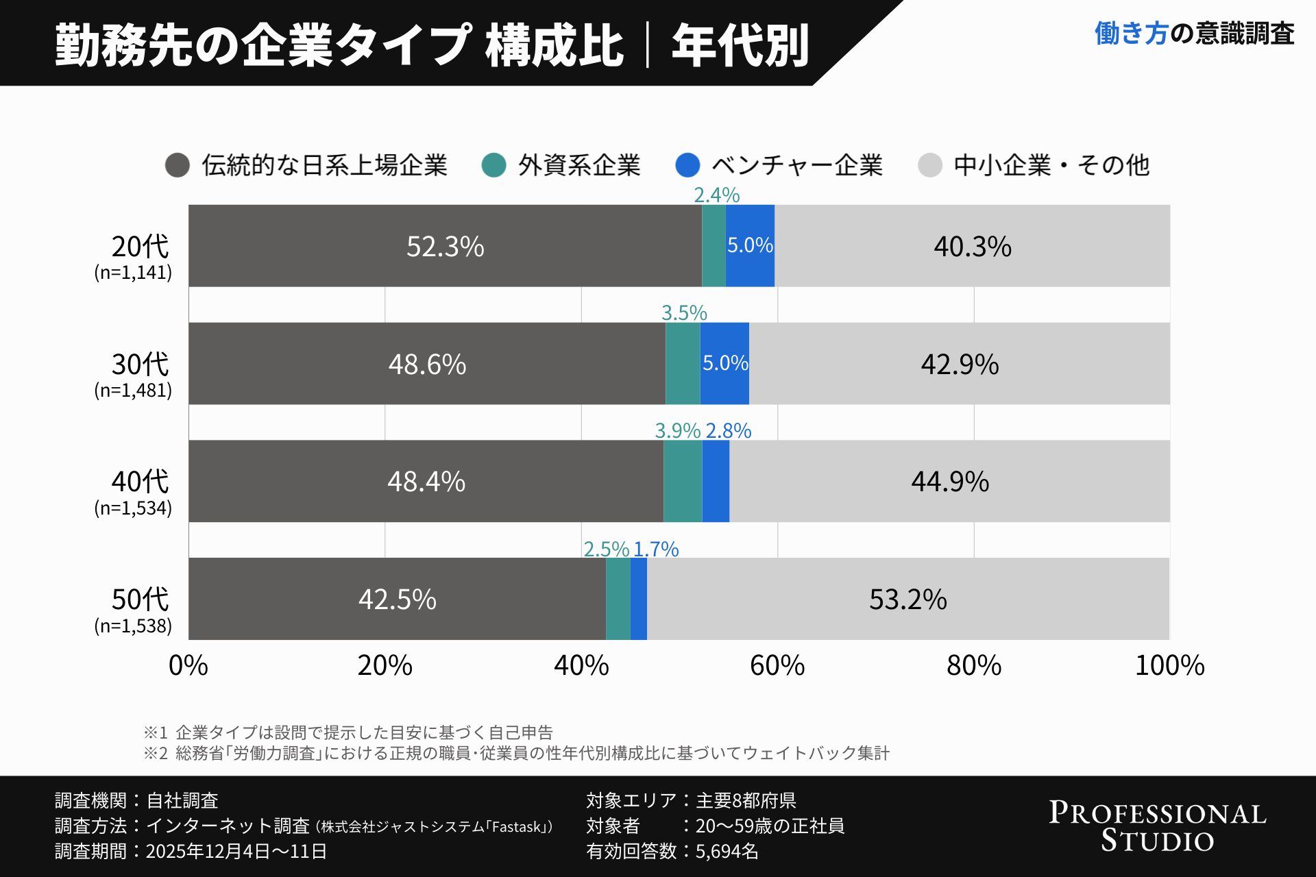 そこで、ベンチャー・中小企業向けのHR総合支援サービスを行うProfessional Studio株式会社( https://professional-studio.co.jp/ )(本社:東京都中央区、代表:市川龍太郎)は、年代や所属企業によるキャリア観の違いを明らかにするため、主要都府県に在住する20歳~59歳の正社員5,694名を対象に調査を実施しました。