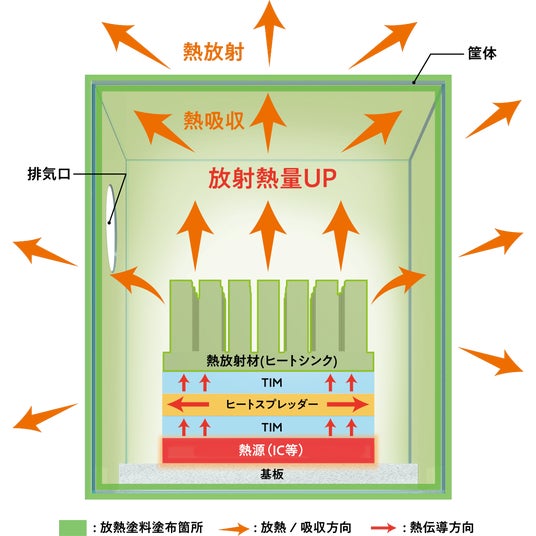 「ラジエックス」は、電子機器および、一部の家電や産業機器、自動車部品などの電子機器が搭載された製品に放熱塗料として使用することで放熱のコントロールを実現し、性能低下を抑制し、製品寿命を延長させることが期待できます。