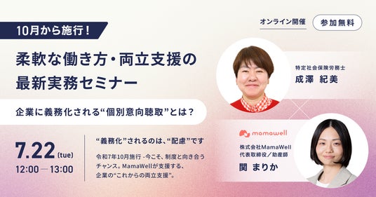妊婦の伴走型体調管理サポートを提供する「MamaWell」では、多数の企業の妊娠・出産期の従業員を支援してきた立場から、この法改正を「企業文化を変えるチャンス」と捉え、企業人事・管理職向けに実務対応をサポートするセミナーを開催します。