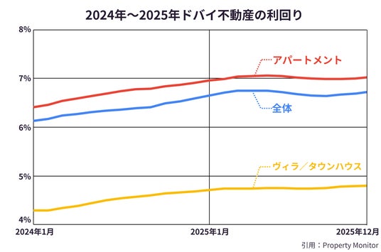 同期間のドバイ不動産全体の利回りは6%台で推移しました。特にアパートメントの利回りは高く、2025年は7%を超えました。
