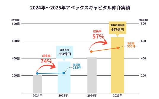 2025年の取引額は、日本市場のみで約364億円、海外市場全体では約647億円となり、前年と比べた成長率は日本市場において74%を記録しています。