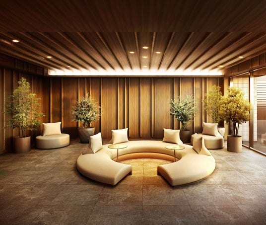 水辺の暮らしを連想させる凛とした建物デザインは、森下にゆかりのある松尾芭蕉の芭蕉庵から着想。蓮池を現代的に表現した枯山水アートをエントランスアプローチに施すなど、シンボリックな建物になるようデザインしております。
