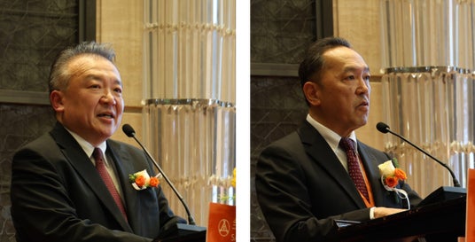 左:在上海日本国総領事館 岡田 勝 総領事・大使 / 右:上海日本商工クラブ 中村 仁 事務局長