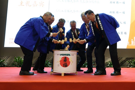 式典では鏡開きが行われたほか、三机建筑工程の会社紹介ムービーや三機工業従業員からのメッセージ動画の上映、「三机建筑工程のあゆみ」をテーマにしたサンドアートのパフォーマンスなどがあり、大いに盛り上がりを見せました。