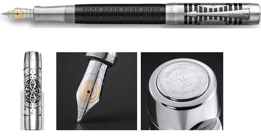 18金ペン先をロジウムプレートで仕上げたバイカラーのペン先には、航空コンパスの緻密さと正確性を表現。天冠には、1928年にPARKERが初めて購入したフェアチャイルド単葉機のモチーフがあしらわれています。ブラックとシルバーの力強いコントラストは、クラシックエアクラフトの機体やプロペラの金属美を彷彿とさせ、PARKERのクラフトマンシップと航空のレガシーが融合した、唯一無二の佇まいを完成させています。