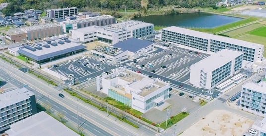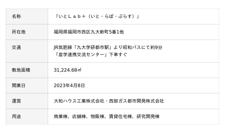 「いとLab+」は、研究施設や商業施設、店舗、賃貸住宅で構成される複合研究開発次世代拠点です。九州大学から徒歩10分程度の場所に位置し、大学の高度な研究設備や評価機器を活用しやすい環境にあります。当社は九州大学の研究者との密接な連携により、先端材料分野における技術革新と製品開発の加速を図っております。