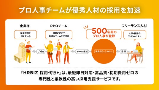 国内最大級のITフリーランス向けエージェント「TECHBIZ」をはじめとした、個人と企業のマッチングサービスを運営する株式会社テックビズ(本社:東京都渋谷区、代表取締役:中島一樹、以下「テックビズ」)は、2025年5月8日より、プロ人事チームが企業の採用業務を加速する、新たなRPOサービス(※)「HRBIZ 採用代行+(プラス)」の提供を開始いたします。企業の採用課題に適したプロ人事チームを編成し、採用戦略から応募者対応まで包括的な支援を行います。プロ人事の特性を最大限に活かし、「最短即日対応」「高品質」、さらに初期費用不要で契約期間・業務範囲・支援体制がカスタマイズ可能な『専門性と柔軟性の高い採用支援』により、企業成長に必要不可欠な柔軟かつ戦略的な人事組織形成を支援いたします。