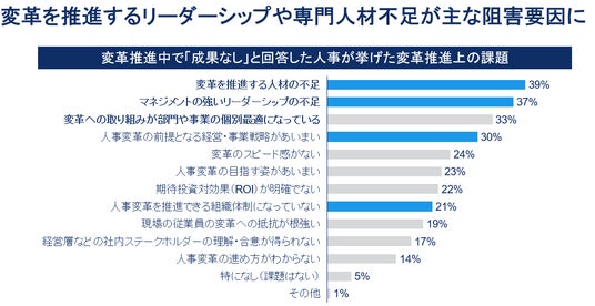 「人事変革を推進しているが、その成果が出ていない」と回答した企業が推進上の課題として挙げたのは、「変革を推進する人材不足(39%)」が最も多く、次いで「マネジメントの強いリーダーシップ不足(37%)」でした。