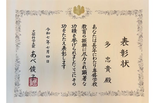 このたび、学校法人電子学園 理事長 多 忠貴(日本電子専門学校/東京都新宿区/校長 杉浦 敦司)が、文部科学大臣より「専修学校教育功労者」として表彰されましたことをお知らせいたします。
