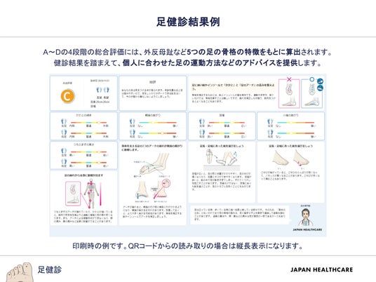 - 足の健康をA~Dの4段階で可視化専門家が足の骨格の特徴をもとに診断し、健康リスクを可視化します。