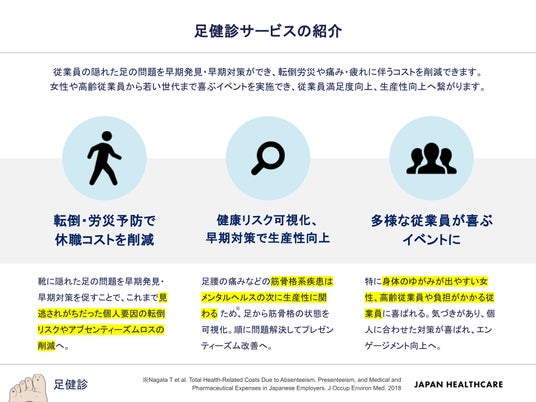 100歳まで歩ける社会を目指す株式会社ジャパンヘルスケア(本社:東京都港区、代表取締役医師 岡部大地)は、健康経営支援の一環として、法人向け「足の健康診断(足健診)」サービスの提供を開始しました。本サービスは、従業員の足の健康状態を可視化し、早期対策を促すことで、転倒・労災リスクの低減や生産性向上に貢献します。