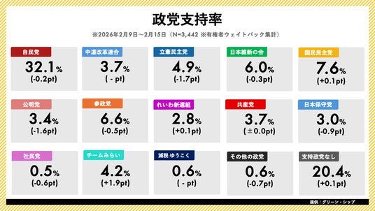 ジャッグジャパン株式会社(本社:東京都渋谷区)は、株式会社グリーン・シップ(本社:東京都千代田区)と業務提携し、グリーン・シップが提供する日次世論調査「世論レーダー」のデータを提供しております。本日、2026年2月第3週(2月9日~2月15日分)の内閣支持率・政党支持率調査の結果を発表いたします。